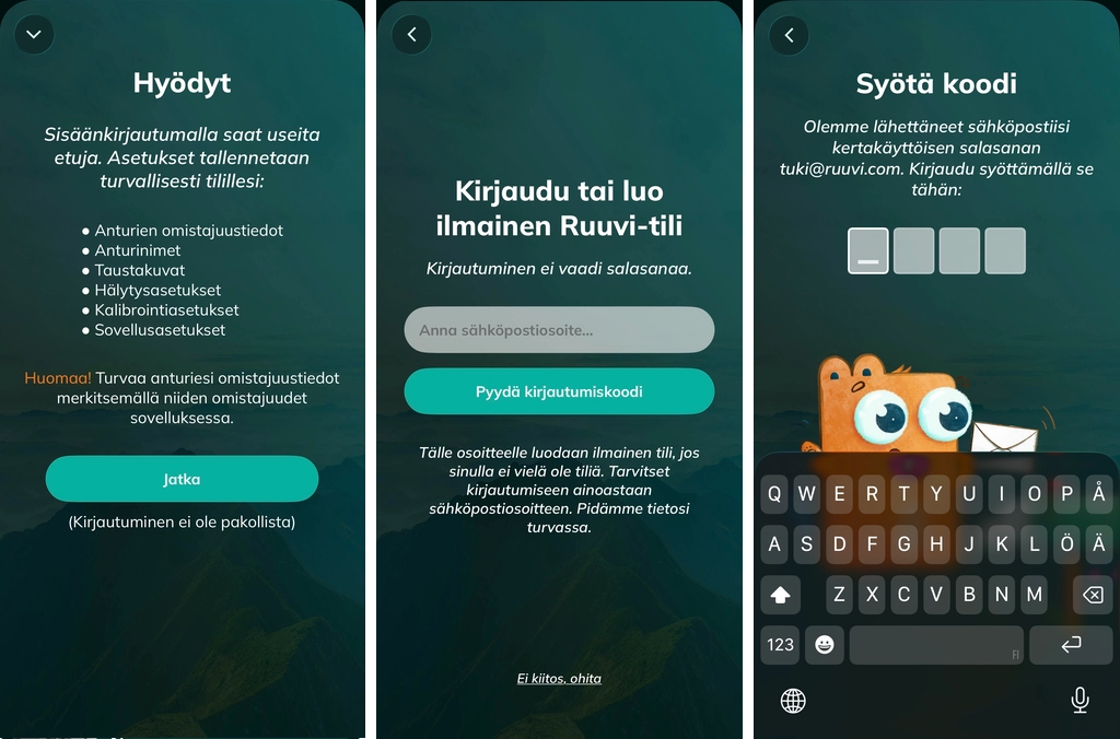 Ruuvi-tilille kirjautumien on oleellinen osa Ruuvi-käyttökokemusta. Ruuvi-tilin luominen on veloituksetonta ja tilin sisältämät ominaisuudet riippuvat valitsemastasi Ruuvi Cloud -pilvipalvelun palvelupaketista. Tiettyjen edistyneiden toimintojen käyttämiseen tarvitset Ruuvi Gateway -reitittimen.