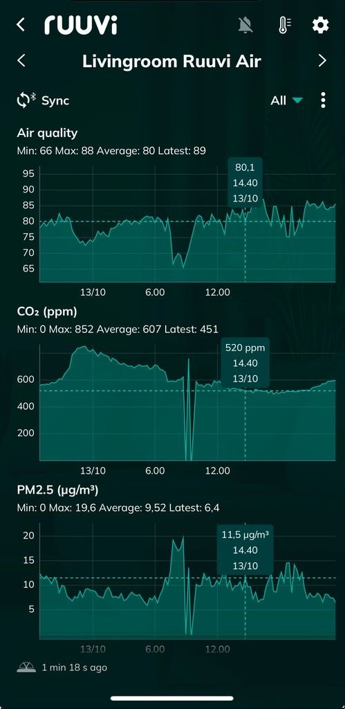 Important notice: not all our Ruuvi Sensors are equipped with the same measurement components. For example, if you have a RuuviTag Pro 2-in-1 that measures only movements and temperature, humidity and air pressure readings will remain empty and are hidden from view. Read more about the different sensors and their components here.