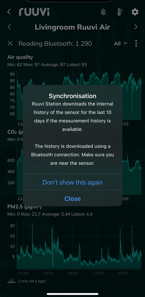 Notice! Synchronisation works reliably when app is in the foreground. A typical data download from a sensor containing 10 days of internally stored measurement data takes about a minute with a medium to strong Bluetooth connection. Synchronisation may be stalled if signal strength is insufficient.