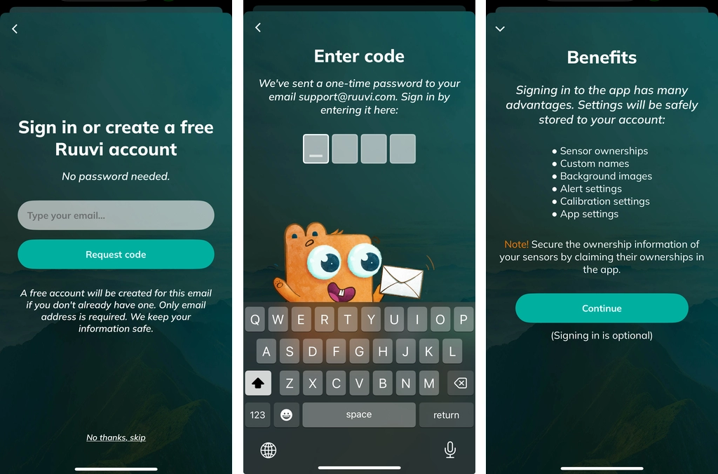 Signing in or creating a new Ruuvi account is based on your email address. A free account will be created if you don’t already have one.