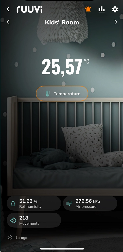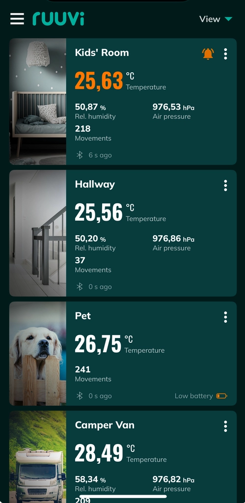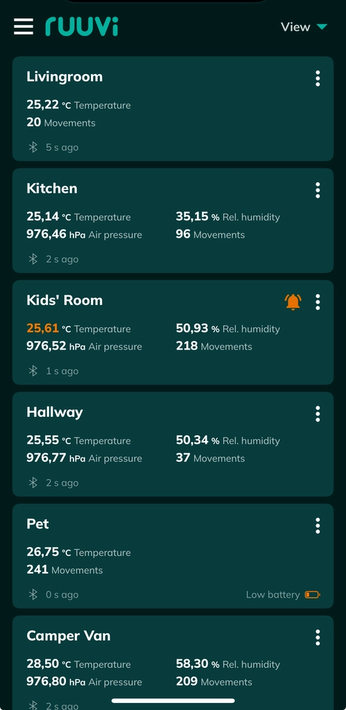 Important notice: not all our Ruuvi Sensors are equipped with the same measurement components. For example, if you have a RuuviTag Pro 2-in-1 that measures only movements and temperature, humidity and air pressure readings will remain empty and are hidden from view. Read more about the different sensors and their components here.