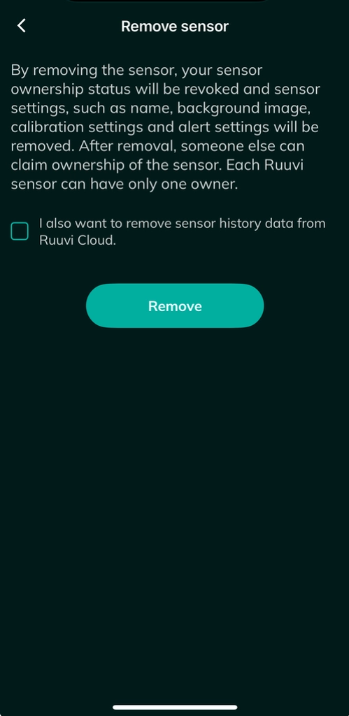 WARNING: Removing a sensor will remove all locally stored history data and associated sensor settings from the Ruuvi Station app.